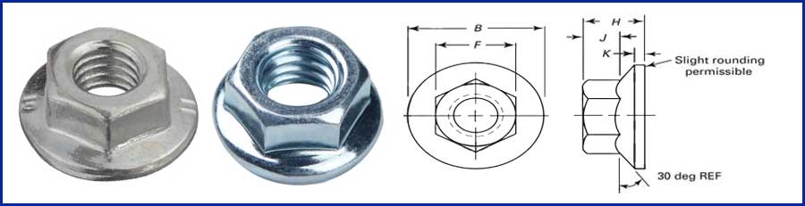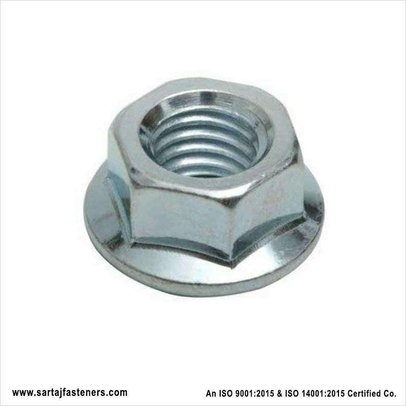 A Flange nut is a nut that has a wide flange at one end that acts as an integrated, non-spinning washer. This serves to distribute the pressure of the nut over the part being secured, reducing the chance of damage to the part and making it less likely to loosen as a result of an uneven fastening surface. The nuts are mostly hexagonal in shape and often coated with zinc. They help in preventing the vibration of the nut from moving the fastener, thus maintaining the holding power of nut.