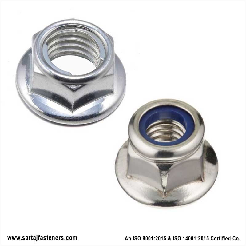 Hex flanged nylock nuts from Sartaj Fasteners have a nylon filled collar, placed behind the nuts. The nuts come with a large circular base flaring out from the front. These screws secure the fastener by applying a downward force on it. Another way in which these nuts secure bolts is by creating extremely tight friction between the nyloc and the threads. While the nut is suitable to be reused multiple times, be wary of the damage caused to the nyloc threads. It is advised to restrict its usage to not more than 50 times.