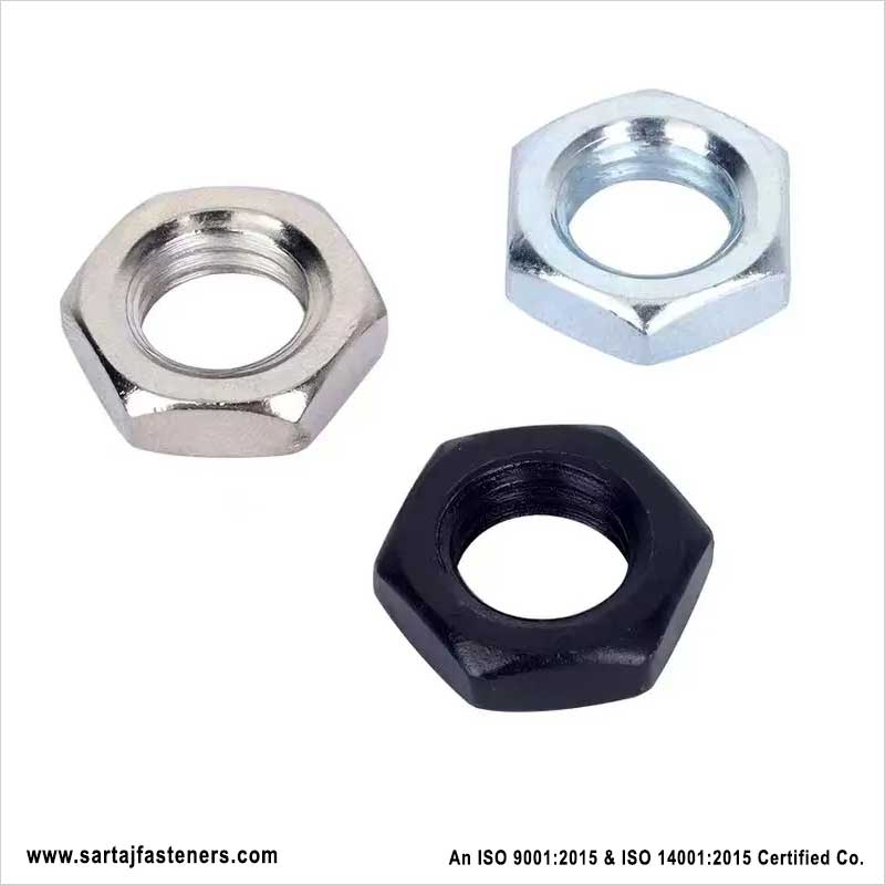 Hex jam nuts from Sartaj are thin nuts which have the same dimensions as the standard hex nut for the head alone. Its primary application lies in fastening the standard nut into place by being threaded onto a bolt and made to run tight against the parent nut. This will ensure that the bolts do not move out of place and will be securely held against vibrations and small and constant movements. In another use, these nuts are used as a leveler to even out surfaces of operations.
