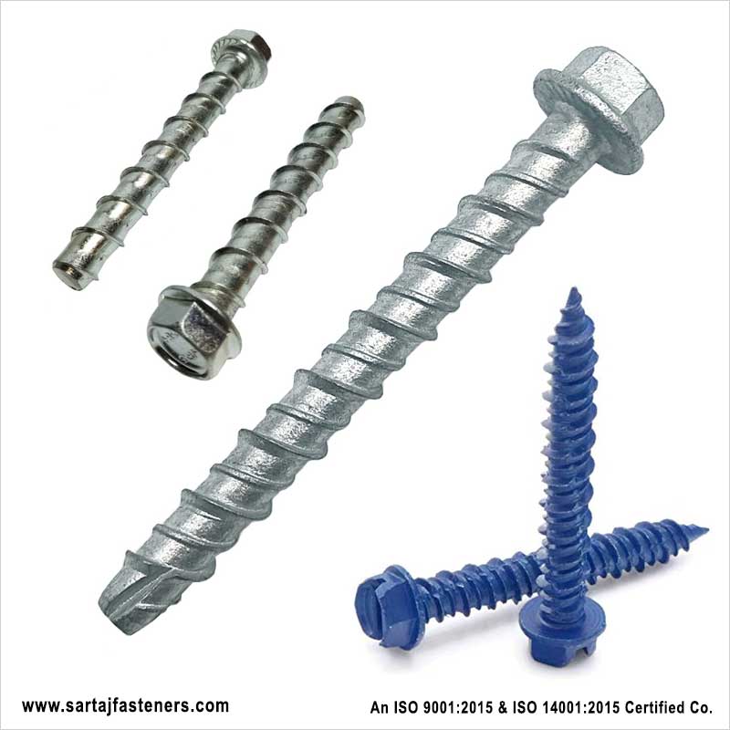 Concrete screws are designed to screw into hardened concrete. A pilot hole created with a concrete drill bit is required. Head styles are flat and hex washer. Hex washer heads provide for greater torque and usually have a slotted, Phillips or star type combination heads. High low threads provide greater holding power and require less torque to install. Typical blue finish provides good corrosion resistance. Stainless steel is also available.