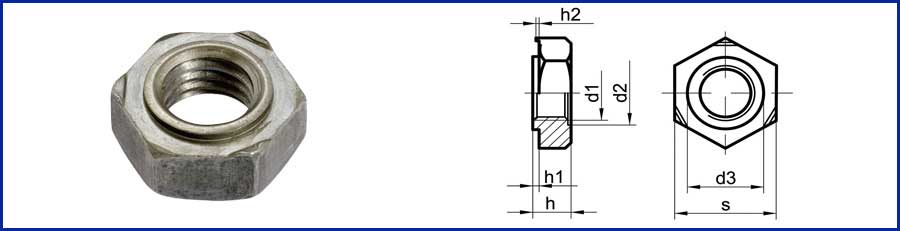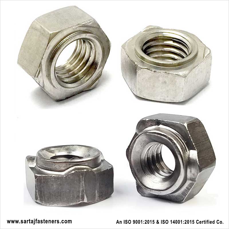 Hex weld nuts from Sartaj Fasteners are used to weld the nut onto a host material. They come with small three leg projections which are used to weld the nut into the material. The projections also help if the host surface is uneven, but the nut has to be fixed flat on the surface. These nuts come with a pilot hole which allows for precision threading while being placed in the accurate location on the surface. Since these nuts are secured in location by welding them into place, it is important to mark and establish its location beforehand.